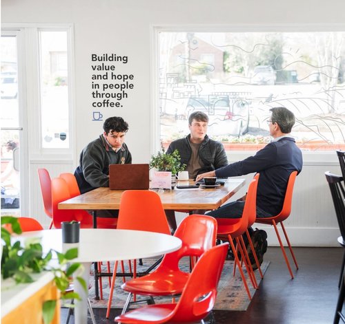 We love and value all our shops equally, but our Flagship location will always hold a special place in our hearts. This is where the dream to create a space that builds value in each person who walks through our doors first came to life. We roasted all of our coffee, hired our first team members from a partner non-profit, opened a specialty coffee drive-thru, survived the insanity of 2020, walked through hard conversations with our team and the community on racial reconciliation (now actively engaging that), and much more all at this location. From the quotes artfully carved into the hand made tables in our expanded seating area, to Brandon’s personally written and painted poem on the wall, and everything between, this cafe tangibly represents so much of our story and who we are.